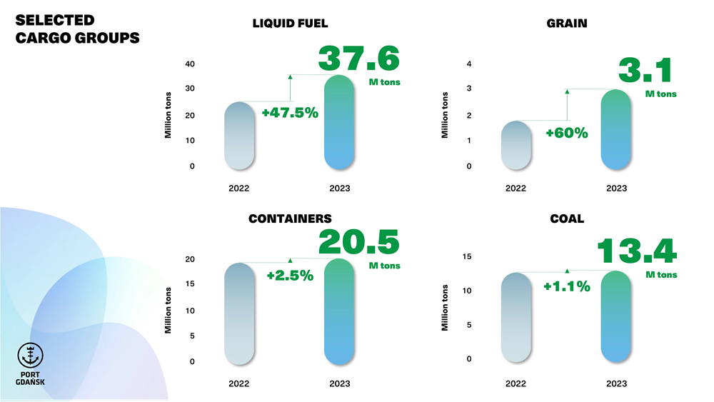 Найбільший відсоток зростання зафіксовано у сегменті сільськогосподарських вантажів — на 60%. Зернові термінали працювали на повну потужність протягом усього року, що безпосередньо пов'язано з блокадою українських портів на Чорному морі та транзитом українського зерна через польські порти, зазначається у повідомленні.