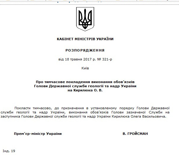В свою очередь согласно другим распоряжениям №316-317-р от той же даты, Олег Кирилюк назначен заместителем главы Госгеонедр, а Николай Фощий – первым заместителем главы Госгеонедр. Кроме того, Кабмин распоряжением №320-р от 18 мая признал утратившим силу свое распоряжение от 23 января 2015 года о назначении руководителем Госгеонедр Николая Бояркина.