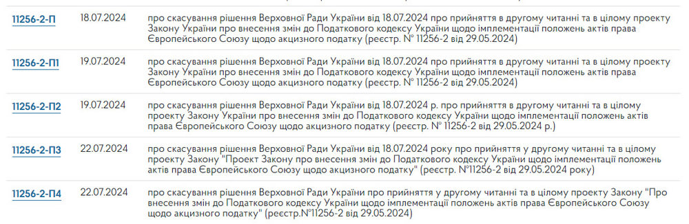 У Верховній Раді України зареєстровано п’ять постанов про скасування збільшення акцизів на пальне, йдеться у картці Проекту Закону про внесення змін до Податкового кодексу України щодо імплементації положень актів права Європейського Союзу щодо акцизного податку 11256-2 від 29.05.2024, проголосованому у другому читанні 18 липня.