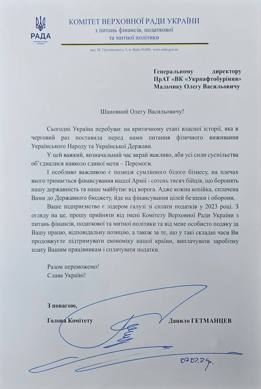 Голова комітету ВРУ з питань фінансів, податкової та митної політики Данило Гетманцев назвав «Укрнафтобуріння» лідером галузі за сплатою податків. Про це йдеться у листі Гетманцева до гендиректора «Укрнафтобуріння» Олега Мальчика, який компанія опублікувала на своїй сторінці у FaceBook.