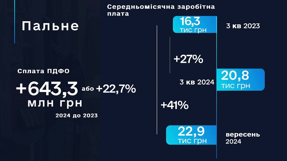 Зокрема, податкова ефективність зросла з 0,62% у 2021 році до 1,07% у 2024 році. Середньомісячна заробітна плата збільшилася на 41%: з 16,3 тис. грн у 3 кварталі 2023 року до 22,9 тис. грн у вересні 2024 р. Сплата ПДФО зросла на 643,3 млн грн, або на 22,7% рік до року, зазначив Гетманцев.