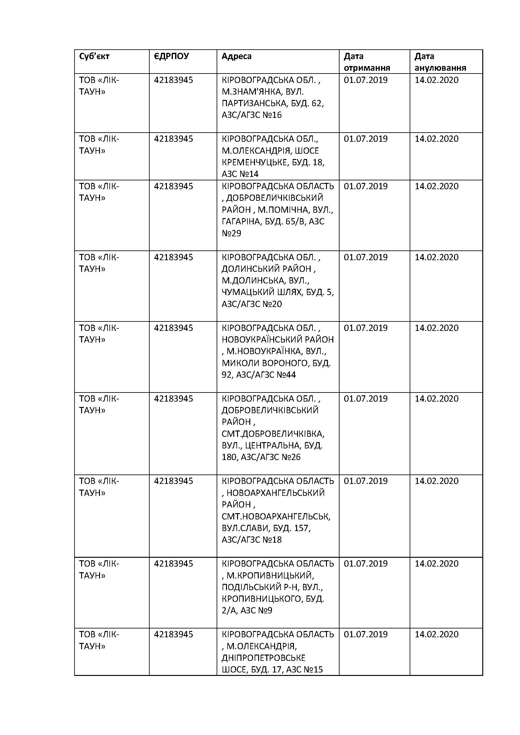 Так, ТОВ «ЛІК-ТАУН» потеряла 18 лицензий в Кировоградской области, ТОВ "ТРАНСФОРМ ТРЕЙД" - 10 лицензий в Хмельницкой области, ТОВ "АЗЕС" - 6 в Винницкой.