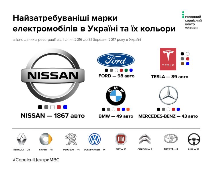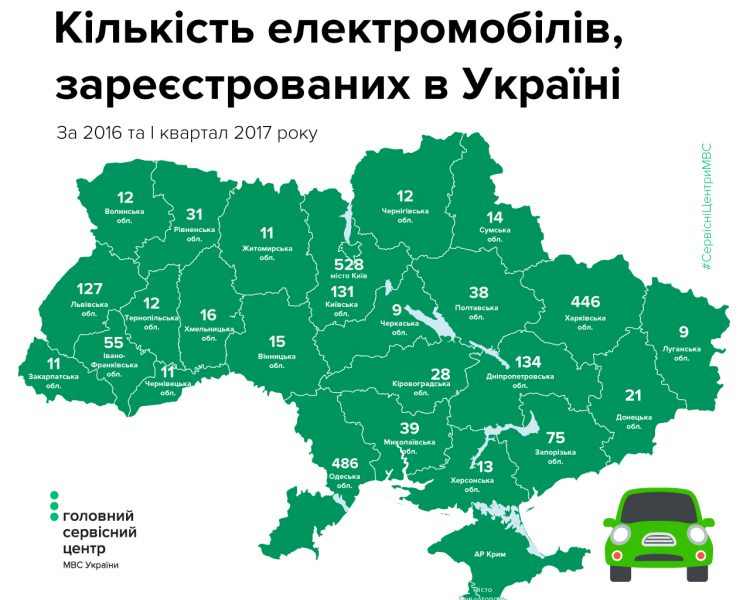 Главный сервисный центр МВД обнародовал показатели электромобилей на дорогах в Украине, которые были зарегистрированы впервые за 2016 и I квартал 2017: статистика регистрации по регионам и календарным гг., популярные марки авто и даже их цвет. Общее количество зарегистрированных впервые электромобилей за этот период составляет 2284.