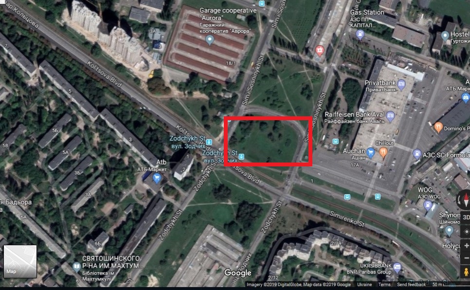 Согласно публичной кадастровой карте Украины участок площадью 1573,1 м2 на пересечении ул. Симиренко и Семьи Сосниных находится в частной собственности и предназначен для розничной торговли и коммерческих услуг.
