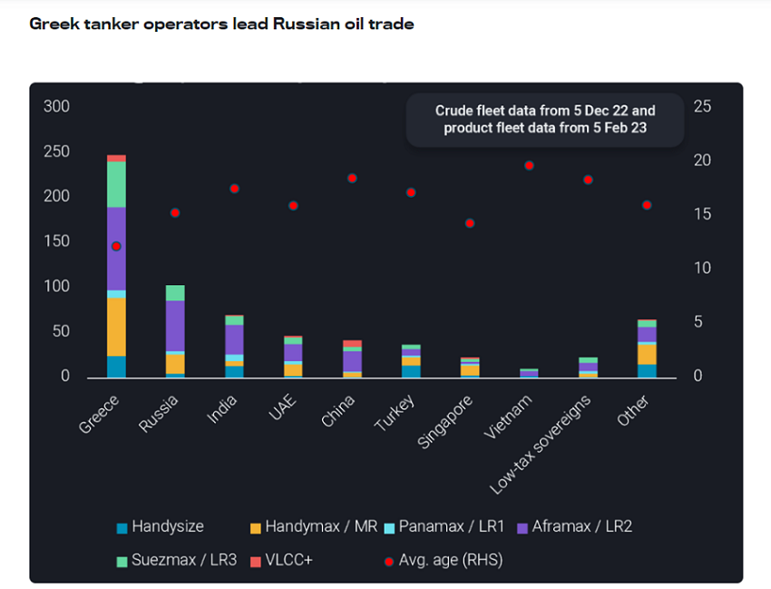 Грецькі оператори повністю домінують на ринку перевезень російської нафти. За даними Vortexa, грецький флот танкерів, який бере участь у перевезеннях, майже в 2,5 рази більший за російський. На російські судна припадає друга за розміром частка.