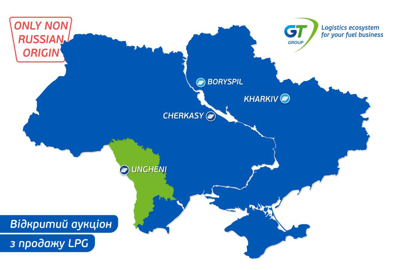 Як зазначається у повідомленні, GT GROUP продовжує реалізацію LPG на умові FCA (автотранспорт покупця) через процедуру електронних торгів. Наразі, скраплений газ доступний на чотирьох базисах: