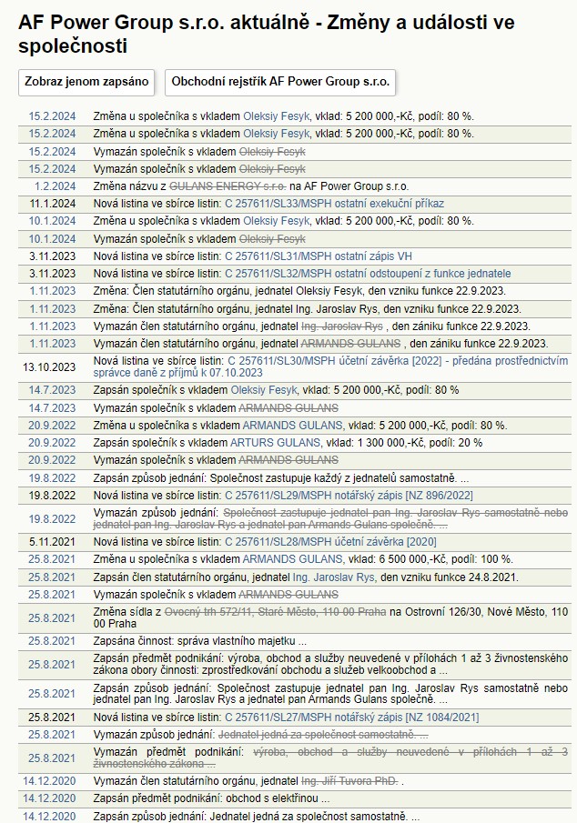 Останні зміни та події товариства AF Power Group зігдно даних порталу rejstrik-firem.kurzy.cz