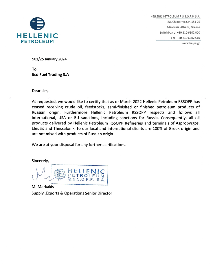 «Відповідно до запиту ми хочемо засвідчити, що з березня 2022 року Hellenic Petroleum RSSOPP припинила отримання сирої нафти, вихідної сировини, напівфабрикатів або готових нафтопродуктів російського походження», повідомив Старший директор з поставок та експорту М. Маркакіс.
