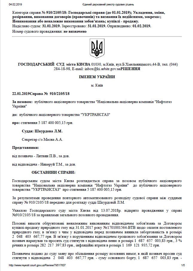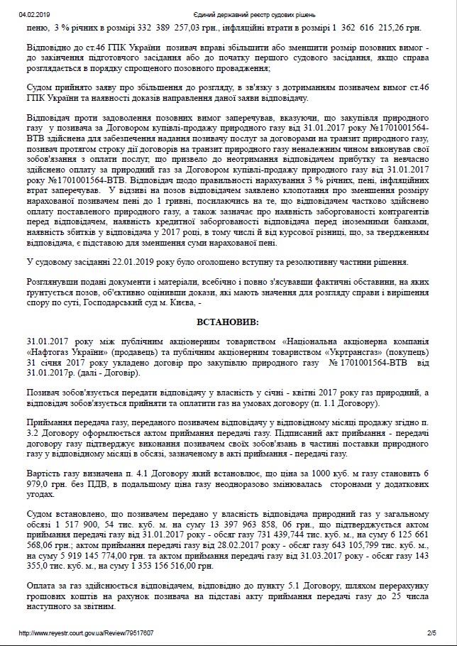 Хозяйственный суд Киева рассмотрел иск АО «НАК «Нафтогаз Украины» к АО «Укртрансгаз» о взыскании 5,187 млрд грн. Исковые требования обоснованы ненадлежащим исполнением обязательств по Договору купли-продажи природного газа от 31.01.2017 года №1701001564-ВТВ по оплате поставленного природного газа в январе – апреле 2017 г.