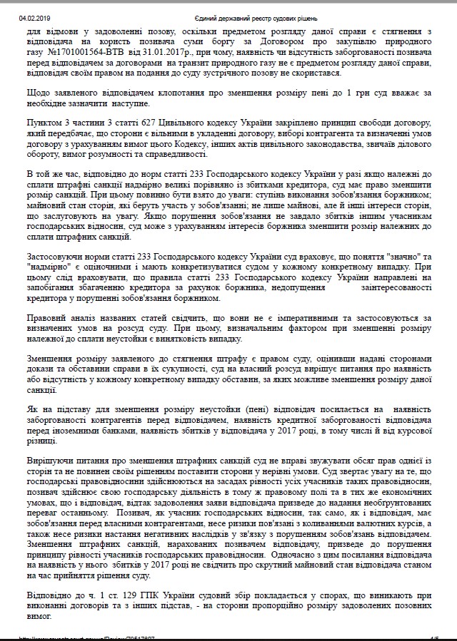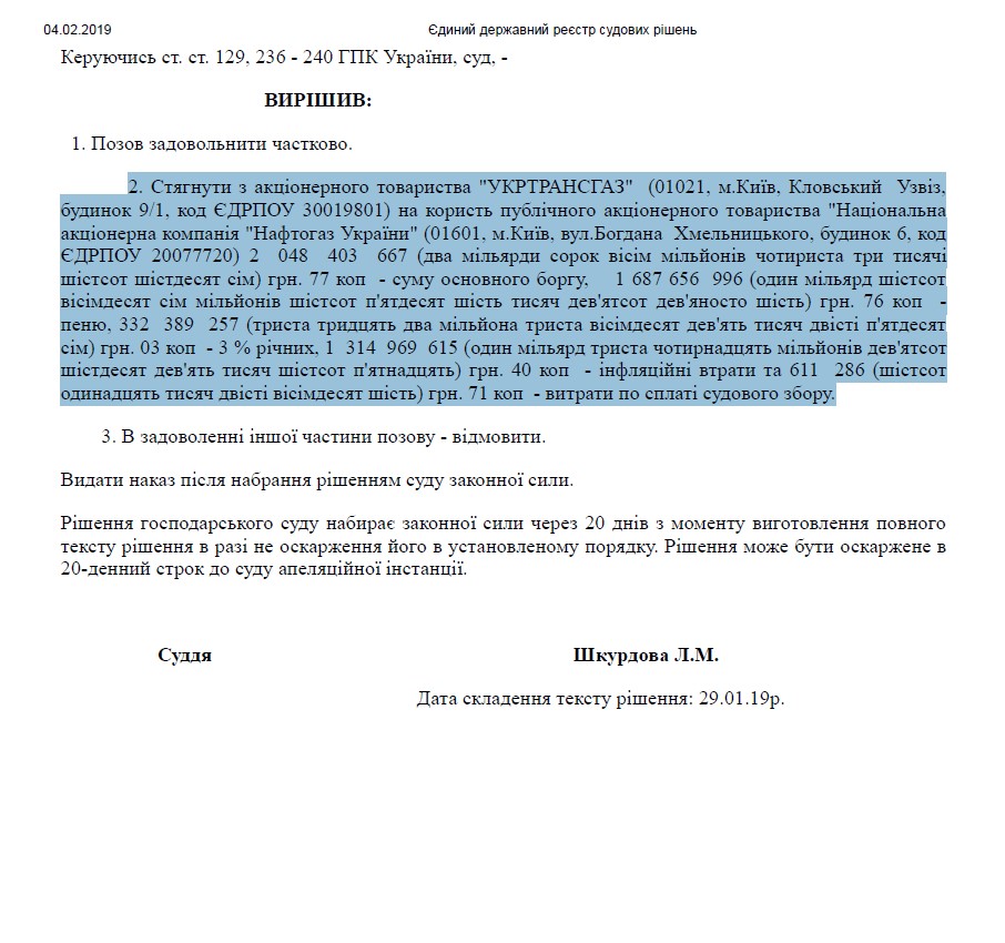 Исследовав материалы дела, судом было решено удовлетворить иск частично в следующем объеме: Взыскать с АО «Укртрансгаз» в пользу АО «Нафтогаз Украины» 2,048 млрд грн – основного долга, 1,688 млрд грн – пени, 332,4 млн грн – 3% годовых, 1,314 млрд грн – инфляционных потерь и 611,3 тыс. грн судебного сбора.