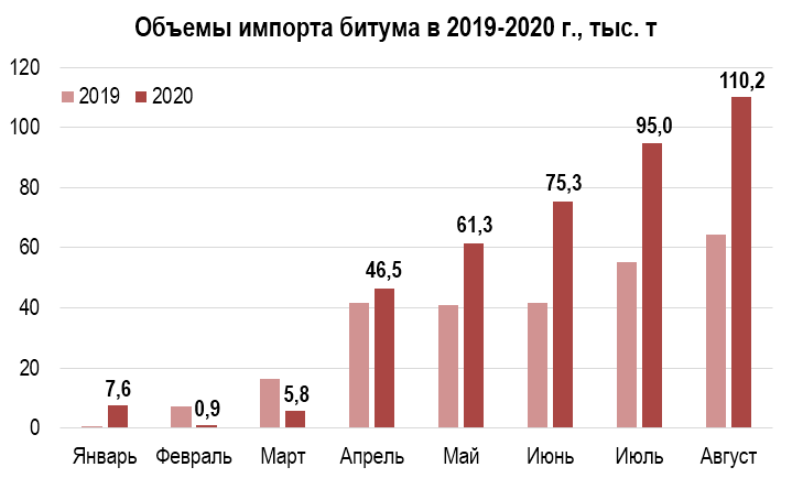 В августе 2020 г. в Украину было импортировано рекордный объем дорожного битума за всю историю – 110,2 тыс. т. Такой объем соизмерим с четвертью всего импорта за 2019 год.