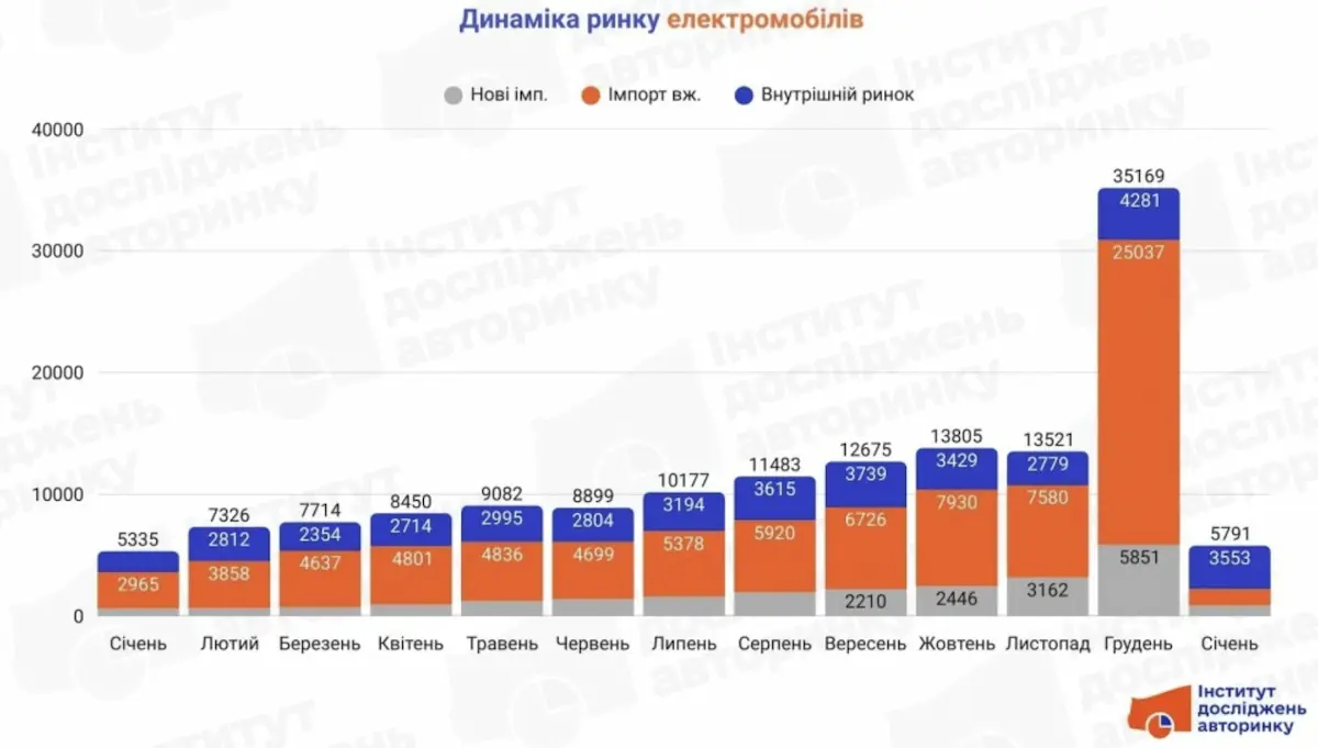 У січні 2026 року імпорт вживаних електромобілів до України скоротився на 94,5% порівняно з груднем 2025 року, до 1 374 одиниць. Порівняно з аналогічним періодом минулого року (січень 2025-го) падіння становило 53,7%, свідчать дані ІДА.