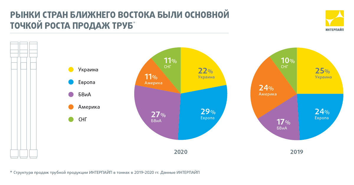Украинская промышленная компания ИНТЕРПАЙП в 2020 году сократила продажи трубной и железнодорожной продукции в тоннах на 17%. Общий объем реализации составил 662,4 тыс. т. Доля экспорта в структуре реализации составила 81%, тогда как доля рынка Украины уменьшилась с 24% до 19%.