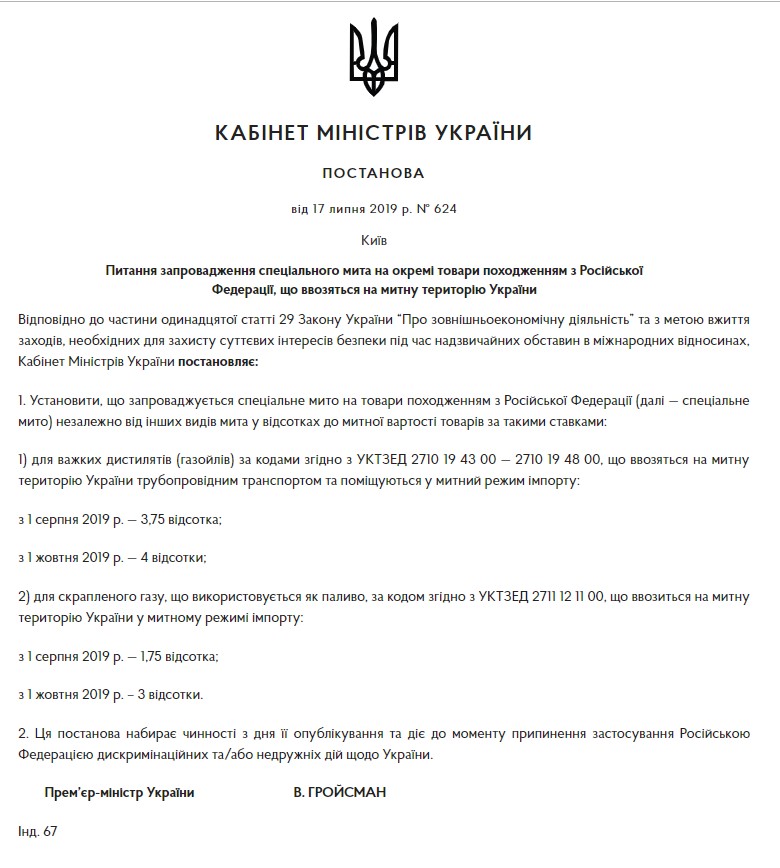 Как ранее сообщалось, Кабинет министров принял постановление, которым ввёл специальную пошлину на импорт из Российской Федерации дизельного топлива (трубопроводным транспортом) и сжиженного газа. Такое совместное решение президента и правительства принято в ответ на расширение российских экономических санкций.
