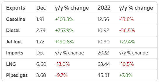 Водночас у грудні 2022 року експорт бензину становив 1,91 млн тонн, що є найвищим показником з жовтня 2020 року.