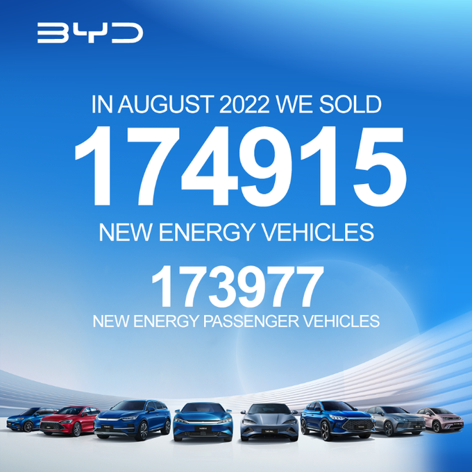 Китайський автовиробник BYD продовжує продавати все більше електромобілів, претендуючи на лідерство в цьому сегменті не лише в Піднебесній, а в цілому світі. В серпні компанія продала 174,9 тис. електромобілів, або, як прийнято писати в Китаї, new energy vehicles. Про це BYD повідомила на своїй сторінці в Twitter.