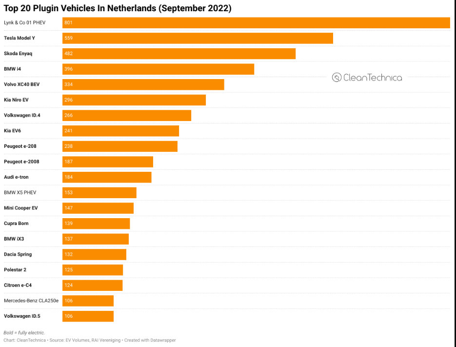 Загалом голландський ринок електрокарів, що заряджаються від мережі (PEV), продовжує зростати, хоча й невеликими темпами: у вересні продажі зросли на 13% порівняно з аналогічним місяцем 2021 року. Це сталося в основному завдяки зростанню попитів на BEV, на які припадало 23% усіх продажів нових автомобілів. Реєстрації на чистих електрокарів у вересні зросли на 15% порівняно з вереснем минулого року.