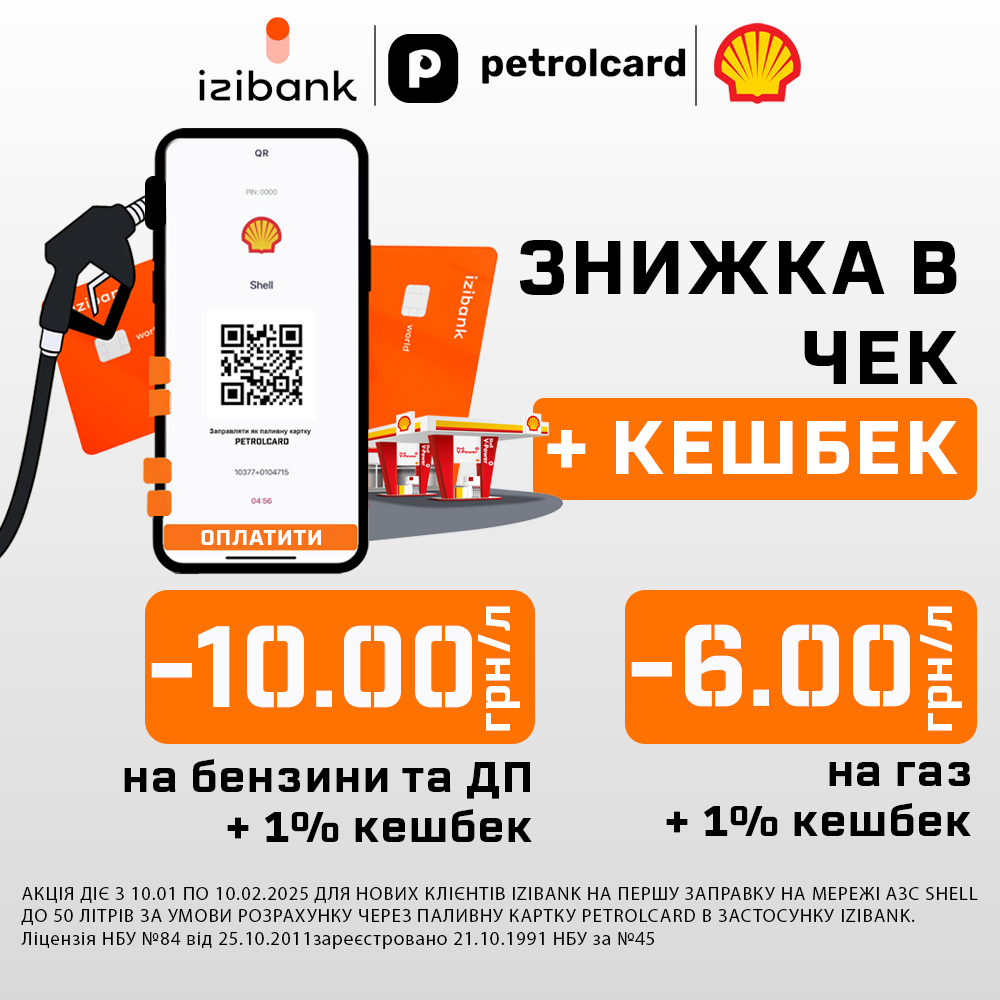 Нагадаємо, у вересні izibank запустив у своєму застосунку універсальну паливну карту, яка надає знижку на пальне на АЗС Shell в Україні та додатково кешбек на суму покупки в чеку.