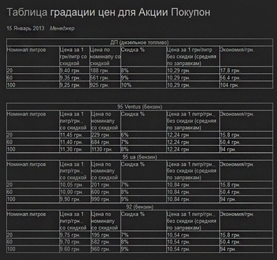 Сервис коллективных покупок "Покупон" 17 января предложил своим пользователям приобрести топливо в сетях КЛО, ТНК и WOG со скидкой до 10% на 20, 60 или 100 л бензина или дизельного топлива. Чтобы получить скидку, необходимо приобрести на сайте "Покупона" соответствующий купон. Так, купон за 5 грн дает 8% скидки на 20 л бензина или дизельного топлива, за 10 грн - до 9% скидки на 60 л бензина или дизельного топлива, за 20 грн - до 10% скидки на 100 л бензина или дизельного топлива.Виды топлива: ДП, 95 Ventus, 95 UA, 92. Приобрести талоны можно только 17 января, а воспользоваться ими до 17 марта. Приобрести можно неограниченное количество купонов. В акции принимают участие более 200 АЗС по всей Украине. Перечень акционных станций можно найти на сайте "Покупона". В акции указано, что скидки на топливо предоставляет компания talony.com.ua. Сайт компании не работает.
