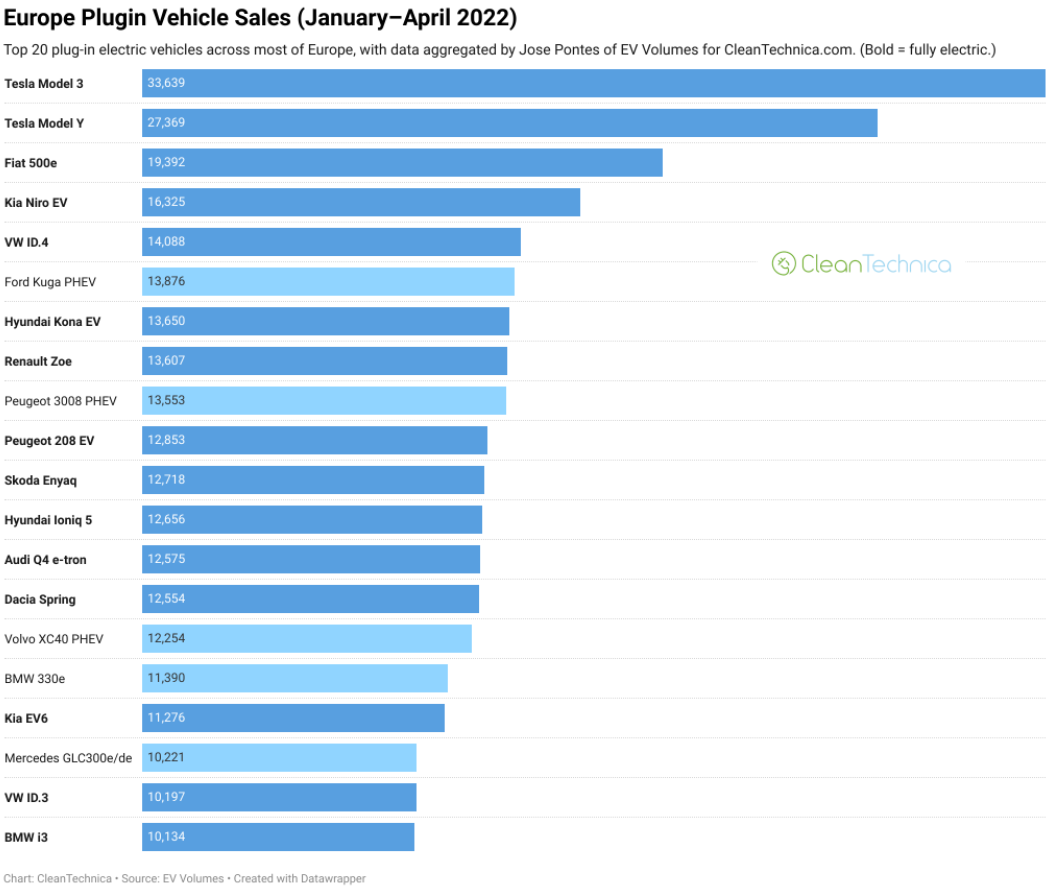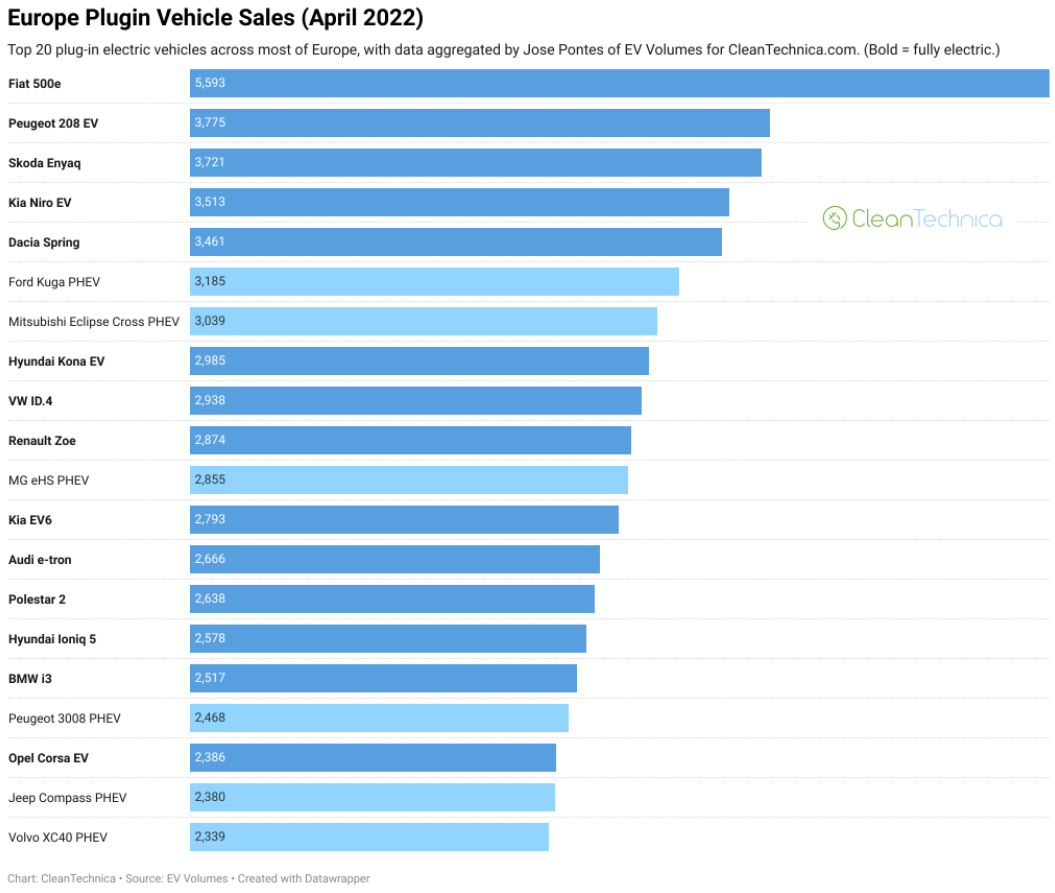 В квітні найпопулярнішим електромобілем в Європі за обсягами продажів був Fiat 500e (5,6 тис. реєстрацій), на другому місці Peugeot 208 EV (3,8 тис. реєстрацій), а на третьому - Scoda Enyaq (3,7 тис. реєстрацій).