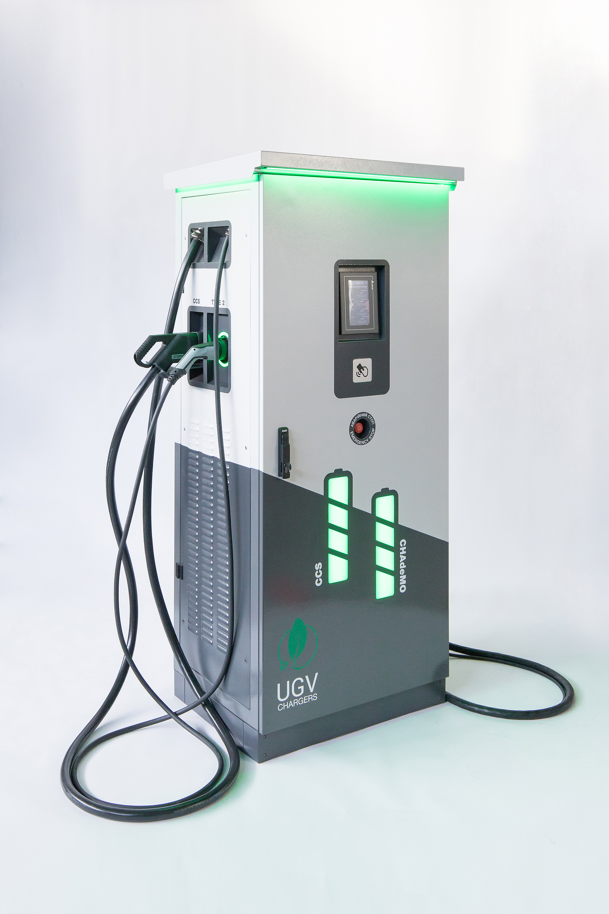 Модельный ряд быстрых зарядных станций UGV Сhargers состоит из электрозаправок мощностью от 40 до 160 кВт с разными типами разъемов: Type1, Type 2, CHAdeMO, CCS, GB/t. Они способны зарядить 80% батареи электромобиля всех производителей всего за 40-60 минут в зависимости от аккумулятора авто. Зарядные станции UGV Сhargers поддерживает одновременную зарядку всех портов, распределяя мощность между портами.