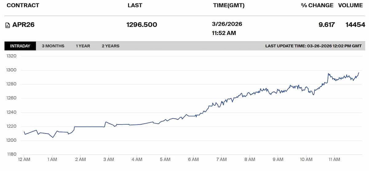 Котирування ICE Gasoil наближаються до $1300 за тонну на торгах на Лондонській біржі у четвер, 26 березня, передає НафтоРинок.