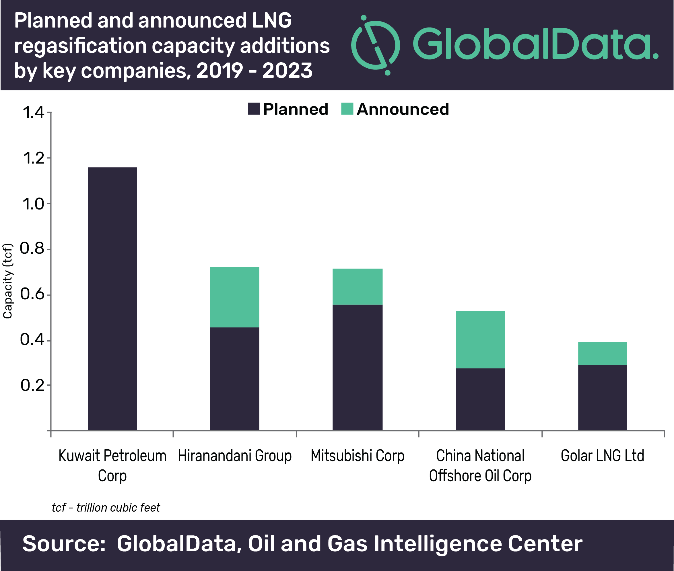 Адития Рекха, аналитик по нефти и газу в GlobalData, объясняет: «Все дополнительные мощности по регазификации Kuwait Petroleum Corp. сформируются из предлагаемого регазификационного терминала LNG Al-Zour в Кувейте. Ожидается, что этот запланированный морской терминал начнет работать в 2020 году с мощностью 1,2 трлн куб. футов».