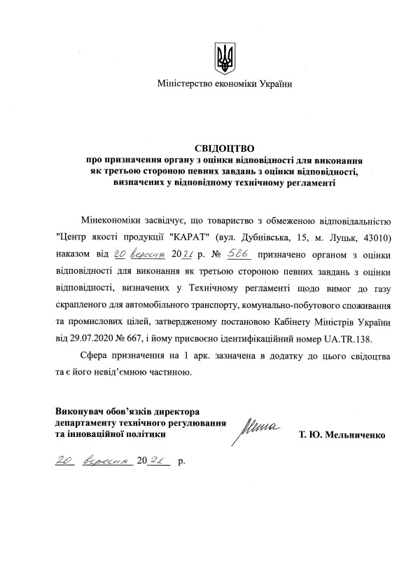 «Назначить общество с ограниченной ответственностью «Центр качества продукции «КАРАТ» (ул. Дубновская, 15 м. Луцьк, 43010, идентификационный код 43776086) органом по оценке соответствия для выполнения как третьей стороной определенных задач по оценке соответствия, определенных в Техническом регламенте о требованиях к сжиженному газу для автомобильного транспорта, коммунально-бытового потребления и промышленных целей, утвержденном постановлением Кабинета Министров Украины от 29.07.2020 No 667», - говорится в приказе за подписью первого вице-премьер-министра Украины – Министра экономики Украины Алексея Любченко.