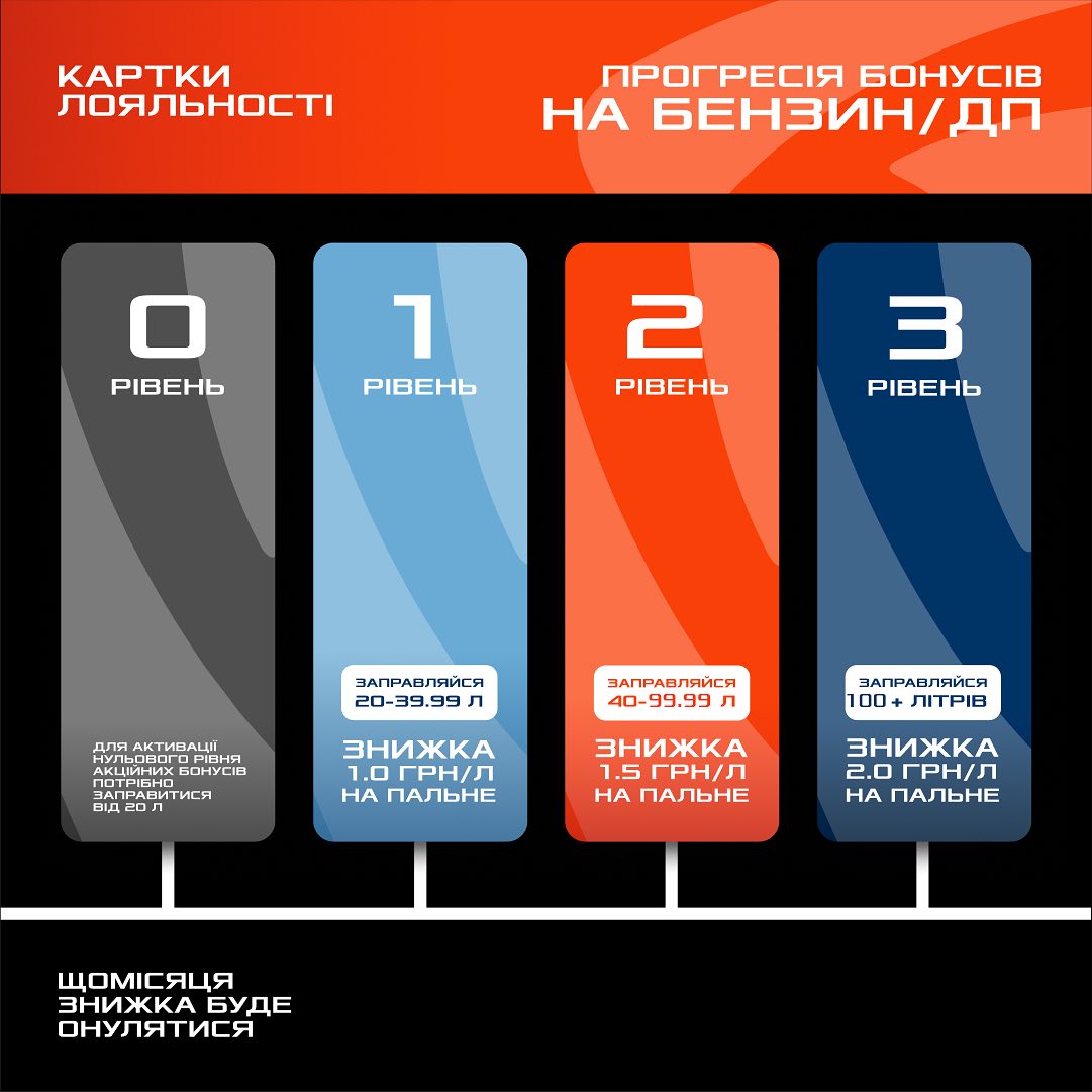 Щоб стати членом програми, потрібно заправитись від 20 л одним чеком та заповнити анкету, після чого оператор видасть картку. З нею знижка на бензин та дизпальне становитиме 1 грн/л, а при покупці протягом місяця 100 л досягне 2 грн/л. На скраплений газ знижка при заправці від 20 л становить 0,5 грн/л , а від 60 л — 1 грн/л. Однак знижка обнуляється щомісяця.