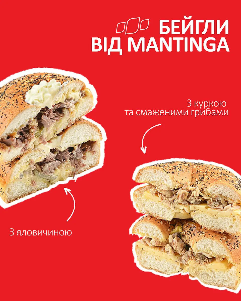 Виробник хлібобулочних виробів Mantinga представив лінійку бейглів — з куркою та грибами, яловичиною, а також з кунжутом і маком. Про це компанія повідомила на сторінці у FaceBook.