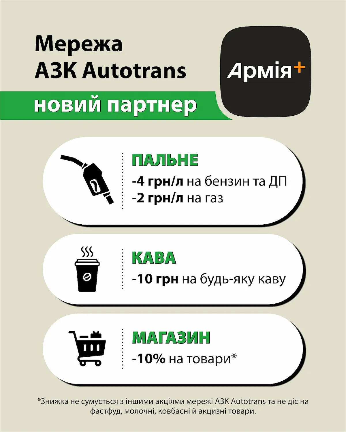 Мережа автозаправних комплексів Autotrans приєдналася до програми Армія+, запропонувавши учасникам оборони України та їхнім родинам спеціальні знижки на пальне, каву та товари в магазинах АЗК.