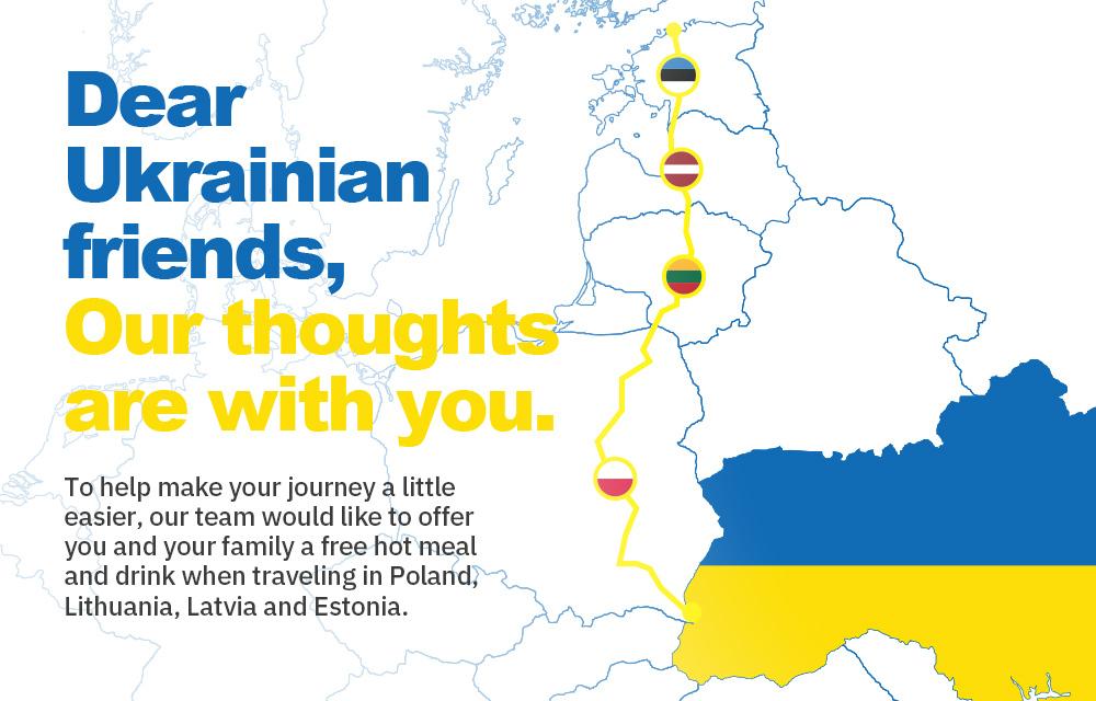 Окрім того, Circle K пригощає українців безкоштовною кавою та їжею на своїх АЗС в Литві, Латвії, Естонії та Польщі. Повний список станцій, що беруть в акції, розміщений на сайті компанії. “Ми підтримуємо наших українських друзів в дорозі, коли вони прямують до сусідніх країн. Щоб трохи полегшити їх подорожі, наші команди в магазинах Circle K пропонують їм безкоштовну гарячу їжу та напої під час подорожей по Польщі, Литві, Латвії та Естонії”, - зазначено в повідомленні компанії.
