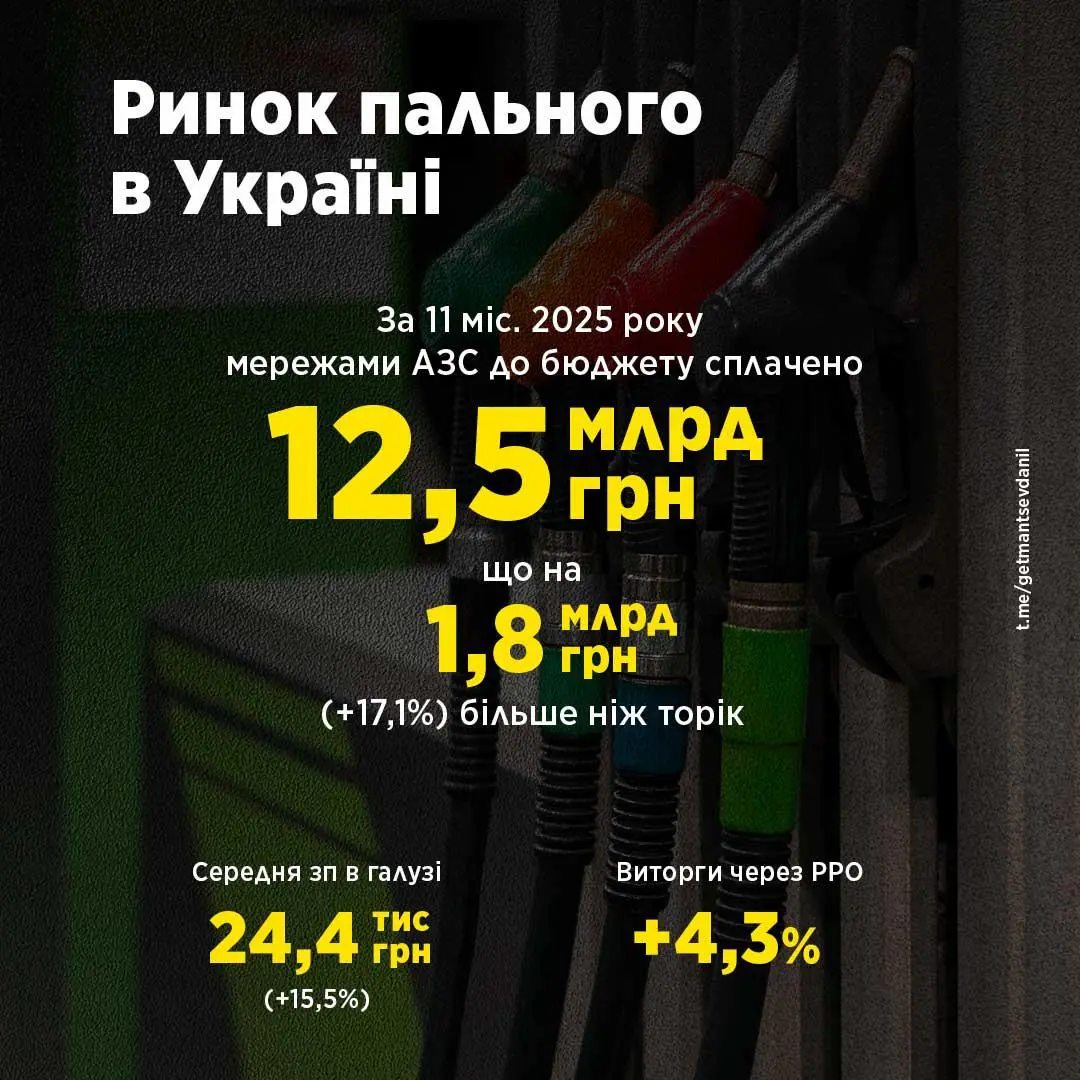 За 11 місяців 2025 року мережами АЗС до бюджету сплачено 12,5 млрд грн, що на 17,1% (1,8 млрд грн) більше, ніж торік.