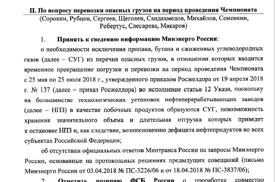В министерстве считают, что сжиженные газы необходимо исключить из перечня опасных грузов, в отношении которых вводится запрет на погрузку и выгрузку на время Чемпионата мира по футболу с 25 мая по 25 июня 2018 года, поскольку это несет себе угрозу затоварки мощностей перерабатывающих предприятий и дефицита топлива в РФ.