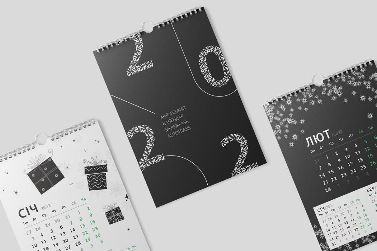 «Каждый календарный месяц мы пытались обыграть по эмоциям, с которыми они ассоциируются. Нашим творческим базовым инструментом стал паттерн. Мы активно используем элементы паттерна в интерьерах и интерьерах АЗК, а также в сувенирной продукции. Можно играть с размерами, миксовать элементы и получать тот же известный паттерн в новой интерпретации. Чтобы подчеркнуть ценность продукта и минималистичный характер бренда решили использовать вечную классику с черно-белой палитрой и акцентами в корпоративном оттенке зеленого цвета», – Алена Бортник, дизайнер сети АЗК Autotrans.