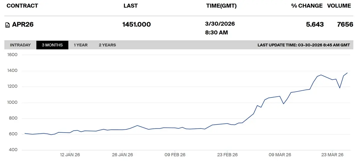 У понеділок, 30 березня, вартість квітневих ф’ючерсів на газойль з низьким вмістом сірки (Low Sulphur Gasoil Futures) в Європі зросла на 5,64% станом на 10:30 за Києвом і становила $1451/т, свідчать дані біржі ICE.