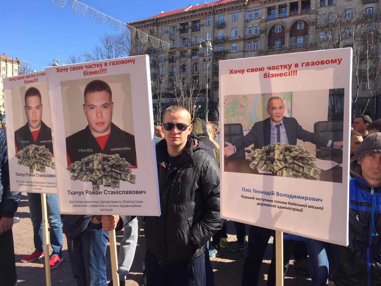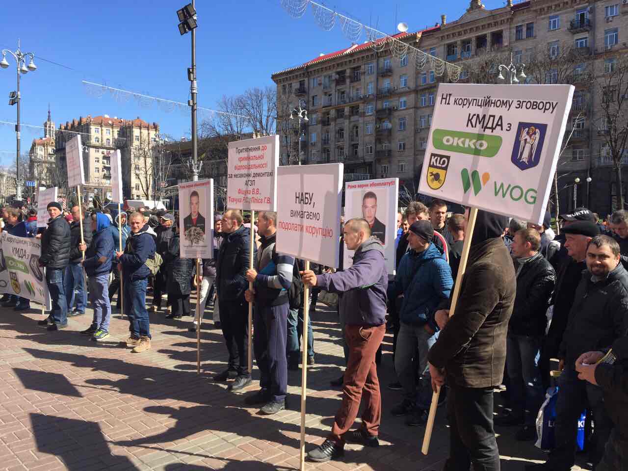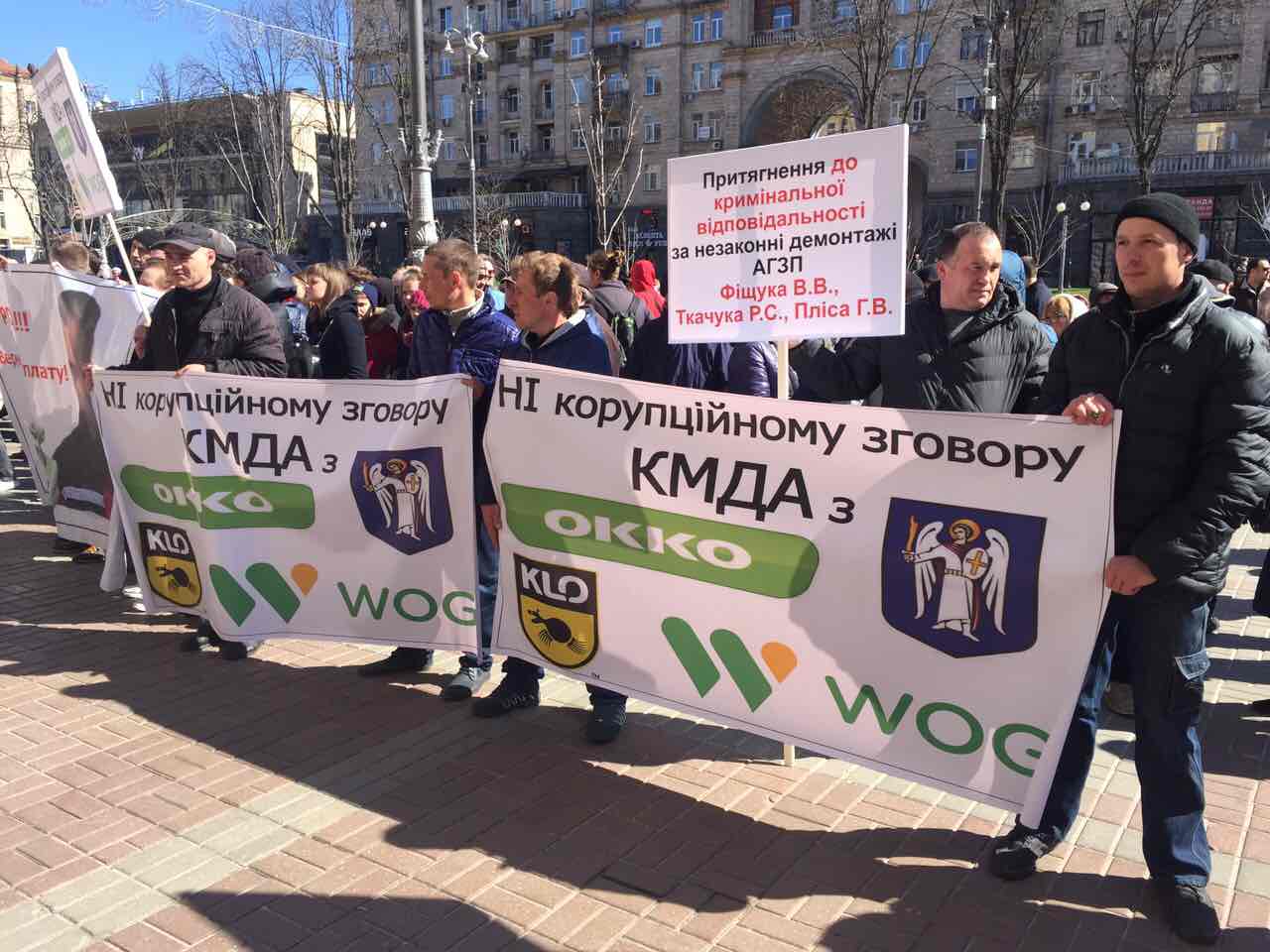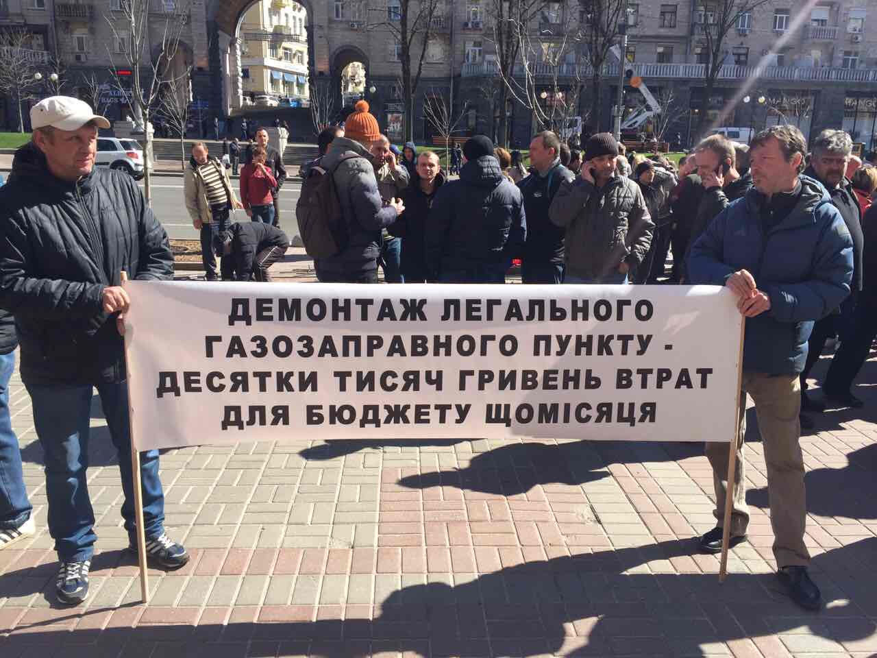 Протестующие скандируют лозунги «Киев без Кличко!!!» и намерены идти колонной к Кабмину и Верховной Раде.На митинг собралось от 300 до 400 человек. Митингующие держат в руках плакаты с призывами остановить незаконные демонтажи и передел рынка. Сотрудники демонтированных газовых заправок видят в демонтажах коррупционную составляющую и передел рынка под крупных операторов. На митинге также присутствует народный депутат Сергей Каплин, который агитирует за создание профсоюза работников АЗС.
