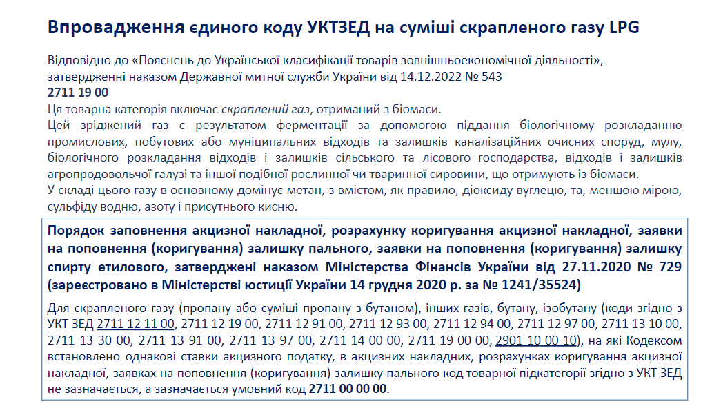 Імпортери повідомляють про вимогу митниці оформляти суміші скрапленого газу за кодом УКТЗЕД 2711 19 00 00.