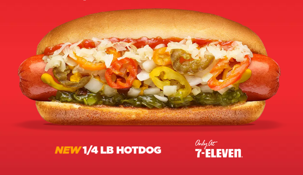 Відомий виробник їжі 7-Eleven зробив розмір сосиски головною ознакою своєї пропозиціїї хот-догів, назва відповідна - Big Bite ¼ фунта. Він містить сосиску з яловичини та м’яку здобну булочку у стилі бріош. Містить хот-дог з приправи – кетчуп, гірчицю, майонез – разом із солоними огірками, нарізаною кубиками цибулею, сумішшю перців халапеньо, квашеною капустою, соусом барбекю, гострим майонезом, сальсою, соусом чилі та сирним соусом начо. Така пропозиція займає третю сходинку рейтингу хот-догів на АЗС США.
