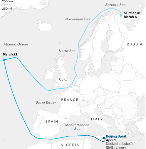 Однак часом доставляти російську нафту - це не так просто. Наприклад, танкер Beijing Spirit перетнув Атлантичний океан з нафтою ЛУКОЙЛу, завантаженою в порту Варандей на Баренцевому морі, і спочатку направився до Філадельфії. На півдорозі через океан він повернув назад, прямуючи до Середземного моря, щоб зрештою розвантажитися на НПЗ ЛУКОЙЛу ISAB на італійському острові Сицилія.