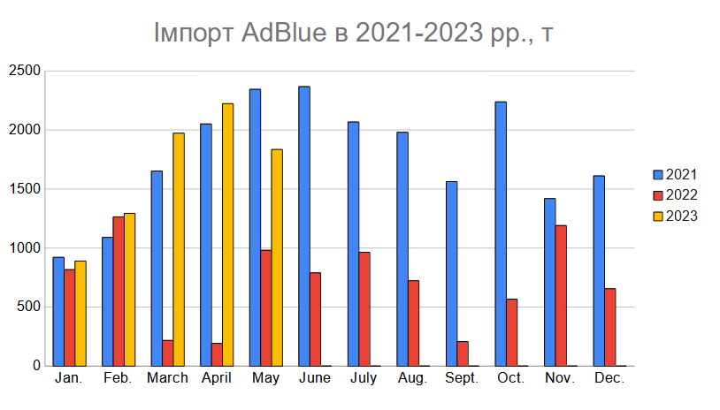 В травні до України було імпортовано 1,835 тис. т AdBlue, що майже вдвічі більше, ніж за аналогічний період 2022 року, коли бізнесова активність серйозно сповільнилася через шок від російської агресії. Водночас у порівнянні з травнем довоєнного 2021 року обсяги імпорту були меншими на 22%. Про це свідчать проаналізовані НафтоРинком митні дані.