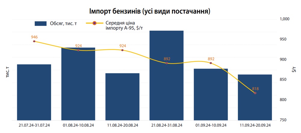Середньозважена вартість бензину А-95 на кордоні за всіма видами постачання у другій декаді вересня зменшилась на $74/т (–8,3%) порівняно з першою декадою місяця, до $818/т.