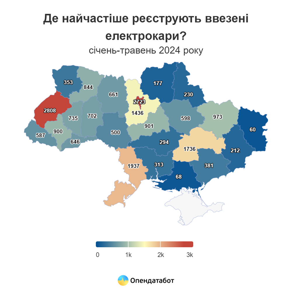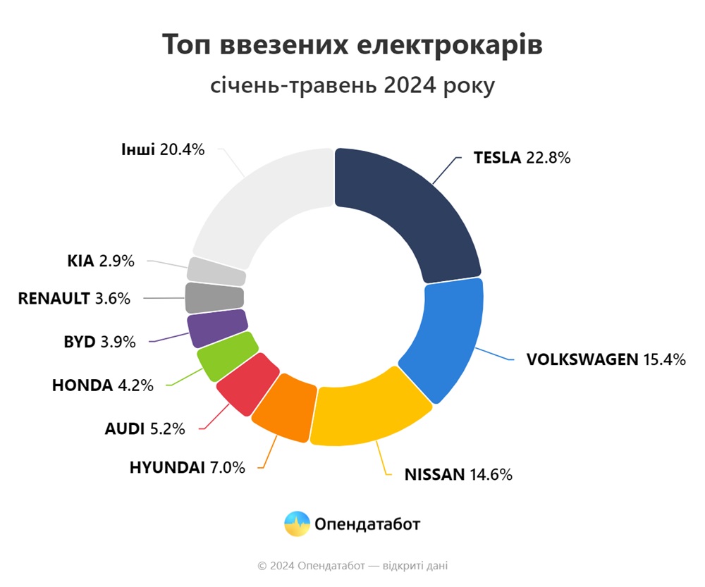 На електромобілі припадає 12,9% від загальної кількості імпортованих автівок. Серед усіх електрокарів найбільшим попитом в українців користується Tesla. У січні-травні 4742 було імпортовано автівки цього бренду. На другому місці — Volkswagen з 3194 реєстраціями, а замикає трійку лідерів Nissan (3034 реєстрацій).