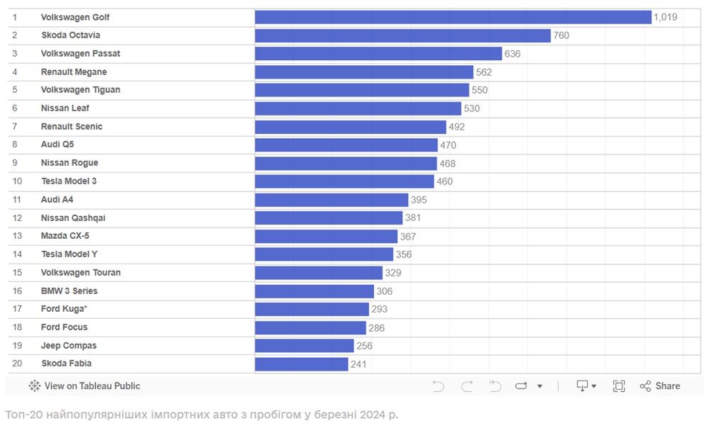 Лідером залишається Volkswagen Golf. У березні до України привезли 1019 авто цієї моделі. Тримати першість Volkswagen Golf допомагає наявність електричної версії e-Golf, яка враховується у загальній статистиці.