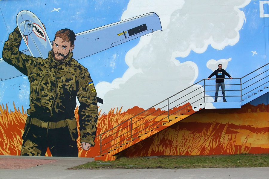 Мурал із зображенням військового з’явився на одному зі столичних АЗК мережі ОККО – на перетині вулиць Богатирської та Лугової, повідомила компанія на своєму сайті. Зображення вкриває всю стіну заправки, сягаючи 30 метрів у довжину та 9 метрів заввишки. На плечі військовий тримає свого помічника – безпілотник ШАРК.