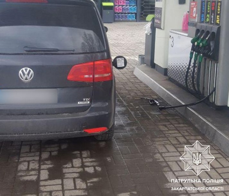 Происшествие случилось вчера, 3 февраля, около 15 часов. Водитель автомобиля Volkswagen заправила свое авто топливом на одной из АЗС, на улицы Бабяка в Ужгороде. Однако, тронувшись с места, забыла про пистолет, который остался закрепленным на топливном баке автомобиля. При этом, как видно на фото, сработала разрывная муфта и шланг не потянул ТРК.