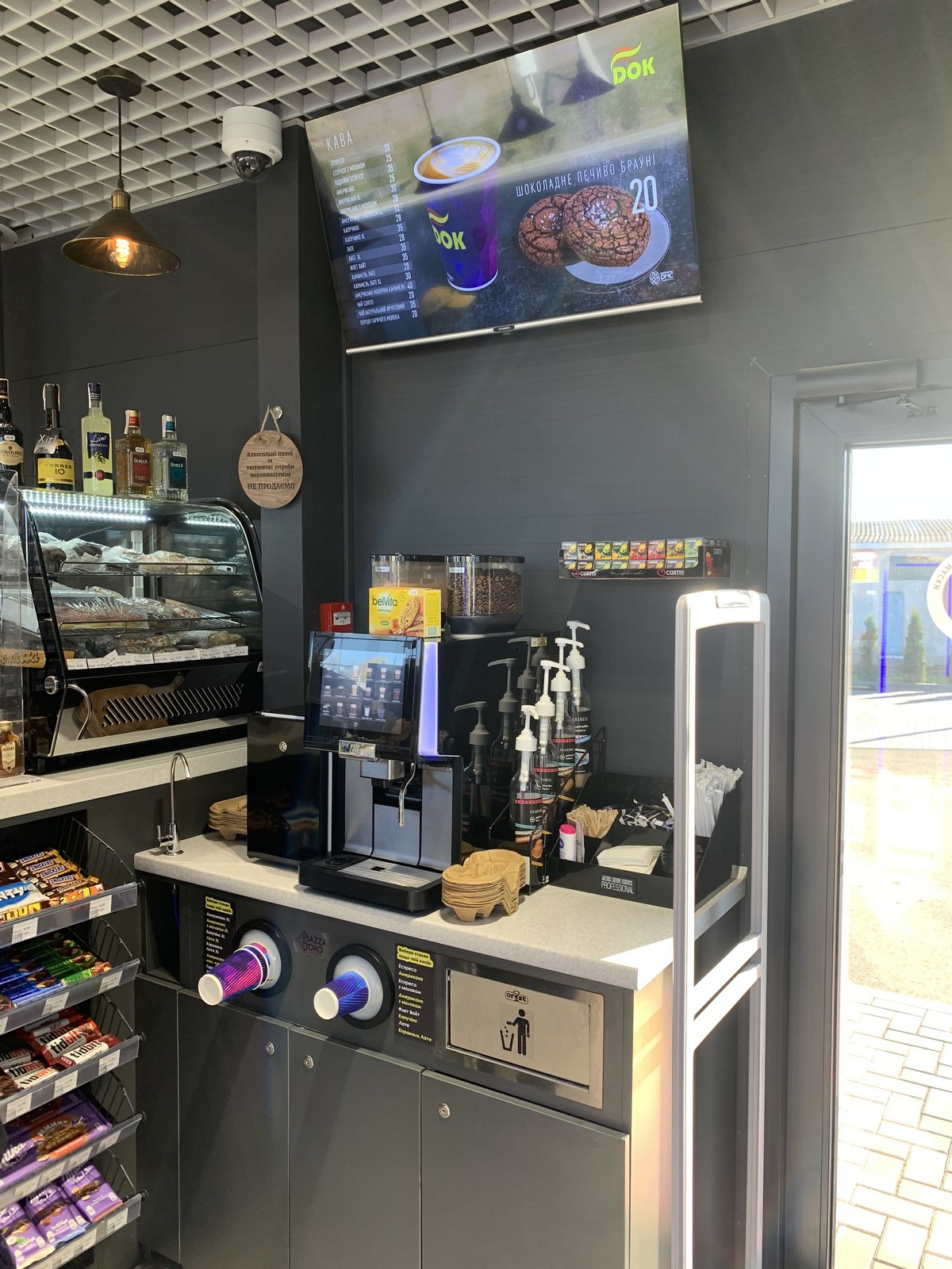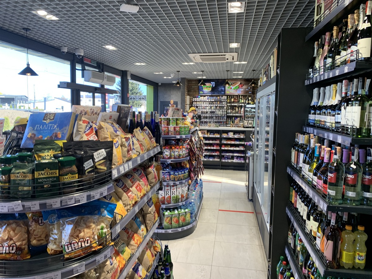 Полки, островки и холодильное оборудование в магазине - Modern Expo, кофемашина WMF, кофе Piazza Doro (™ Jacobs). Есть в меню и хот-дог, стрит-пицца, фреш бургер Mr.Grill.