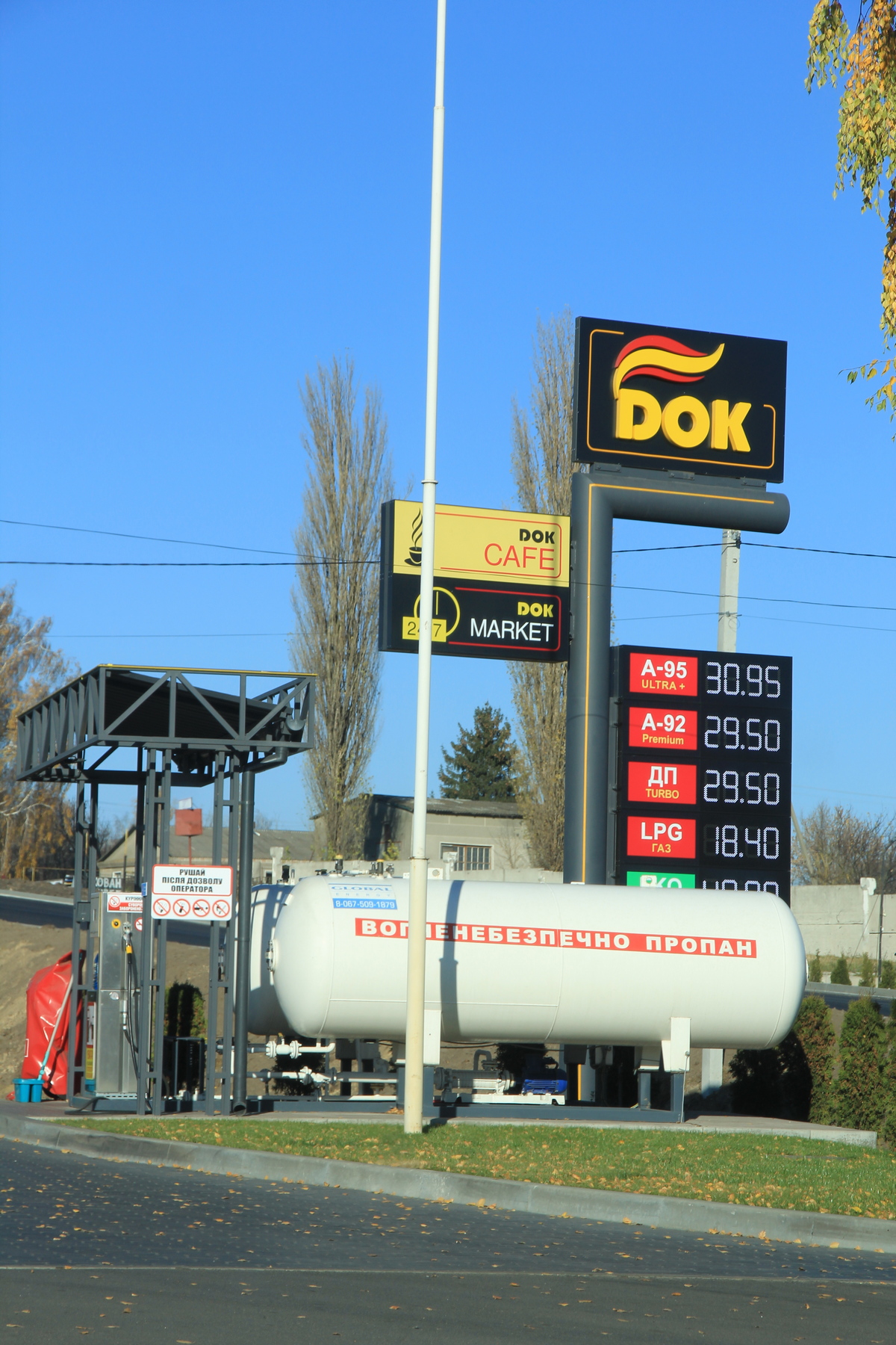 Проект АЗС DOK выполнили местные дизайнеры с житомирской Architecture Design Studio, а оригинальную стелу разработали харьковчане с «Новой идеи». На станции установлены две ТРК «Геркон», две точки зарядки «Еле Кар Груп», а также модуль LPG (колонка Adast). Digital Signage реализовала компания Innovative DMC.