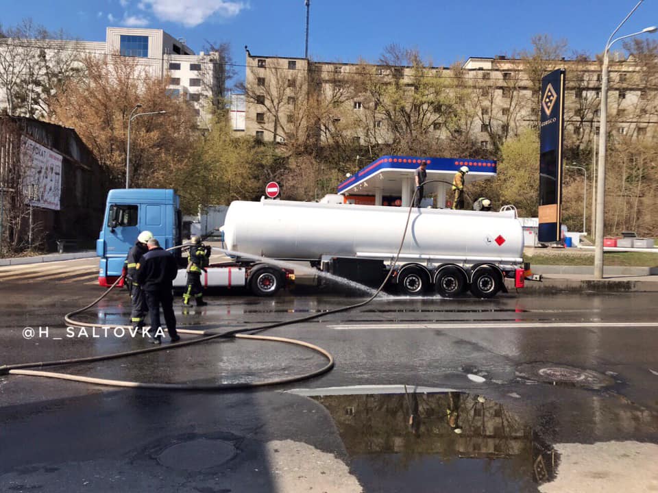 Это произошло из-за повреждения цистерны грузовика. Ул. Шевченко (от перекрестка с ул. Маршала Бажанова) частично перекрыли. Сейчас спасатели охлаждают цистерну.