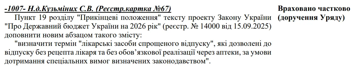 Правка до Держабюджету на 2026 рік Кузьміних Сергія передбачає доручити Кабінету Міністрів України визначити термін «лікарські засоби спрощеного відпуску», які дозволені до відпуску без рецепта лікаря та без обов’язкової реалізації через аптеки,за умови дотримання спеціальних вимог визначених законодавством.